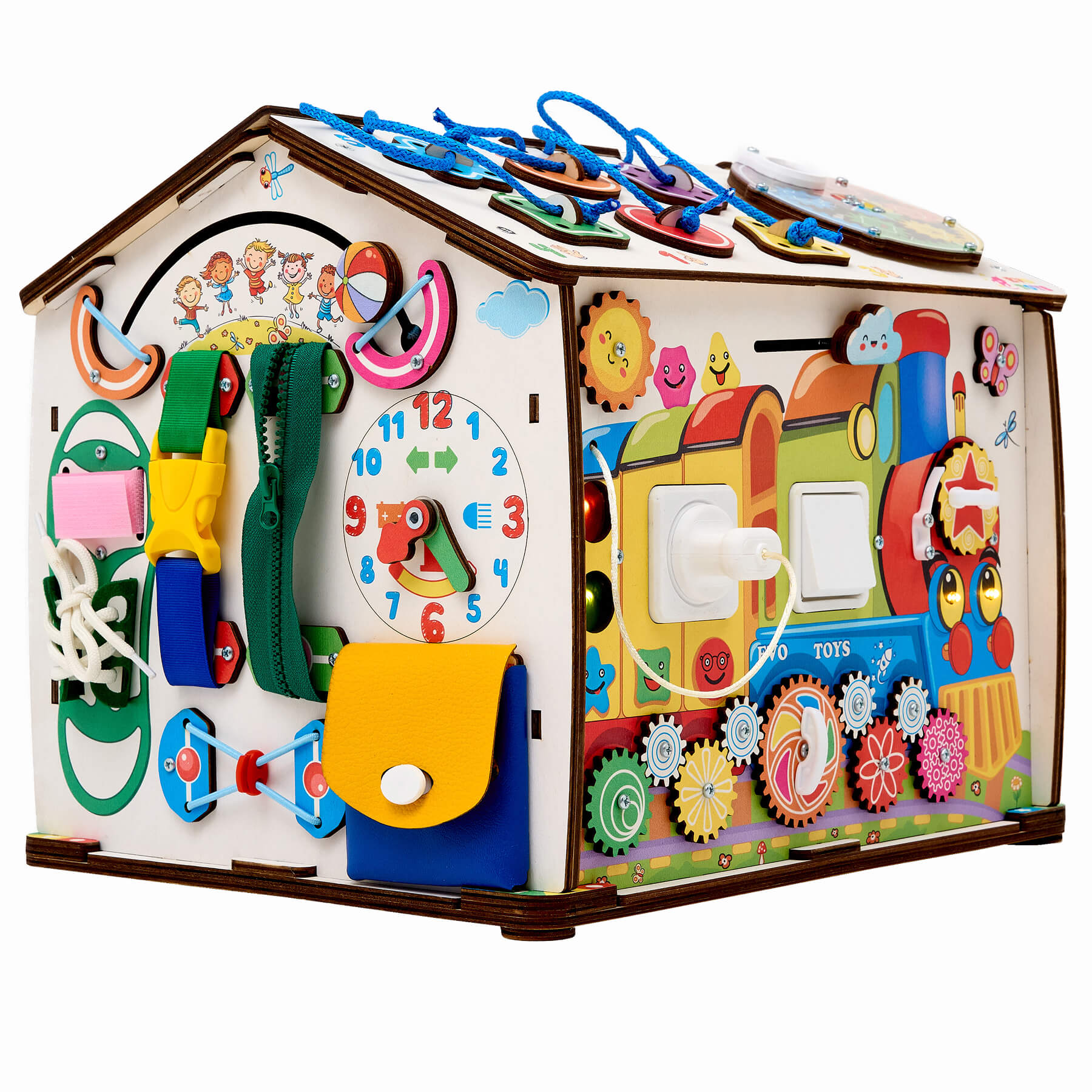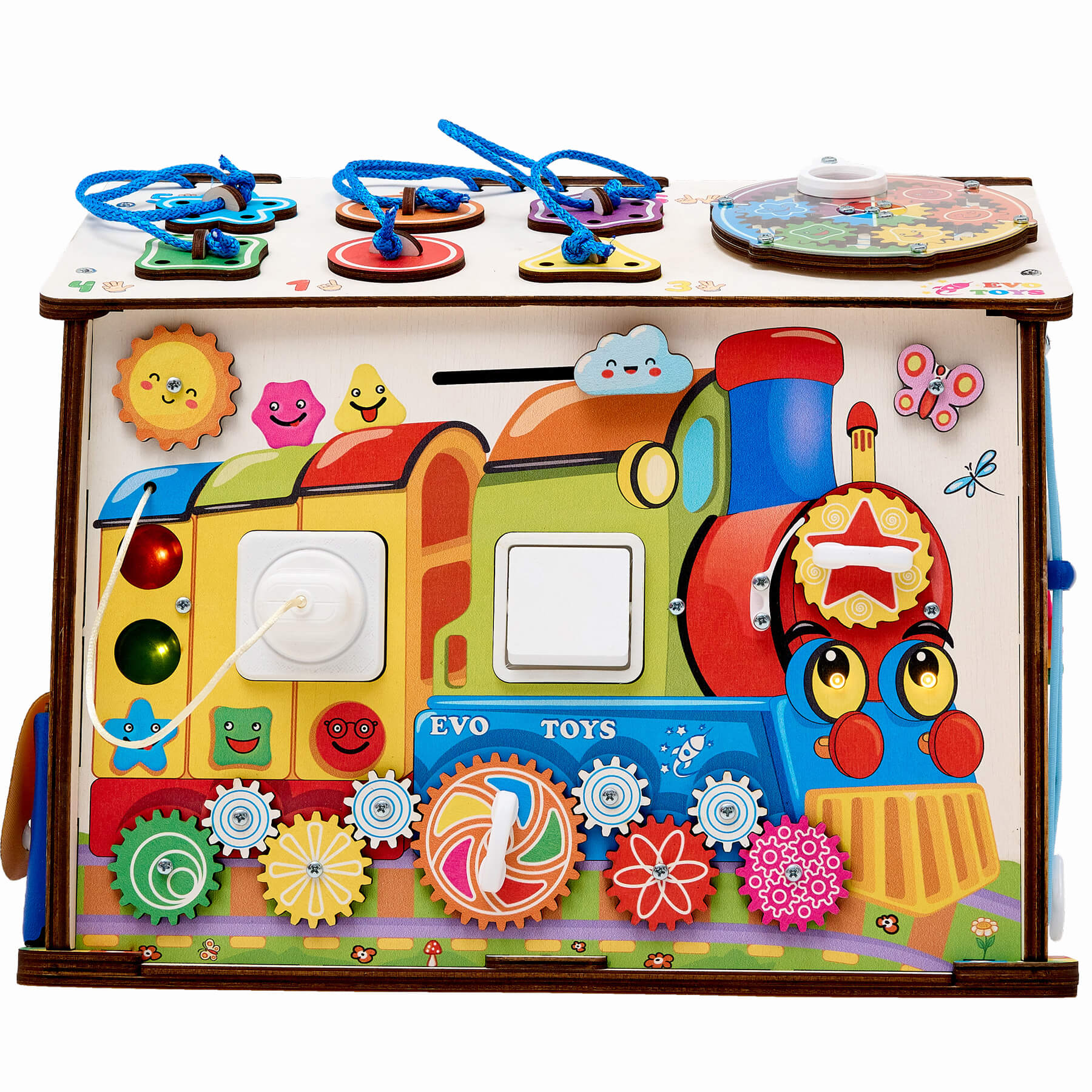 Здесь находится сортер на шнуровке и яркий вращающийся механизм с шестерёнками. Фигурки разной формы продеваются через шнурок, что развивает мелкую моторику, координацию рук и глаз, а также готовит руку к письму. Большой круглый механизм с шестерёнками запускается одним движением — и все элементы начинают вращаться одновременно. Наблюдая за движением, ребёнок понимает принцип взаимодействия деталей, развивает причинно-следственное мышление и просто получает удовольствие от процесса. Пазлы на этой стороне также двусторонние, поэтому игра остаётся разнообразной и каждый раз открывается по-новому.